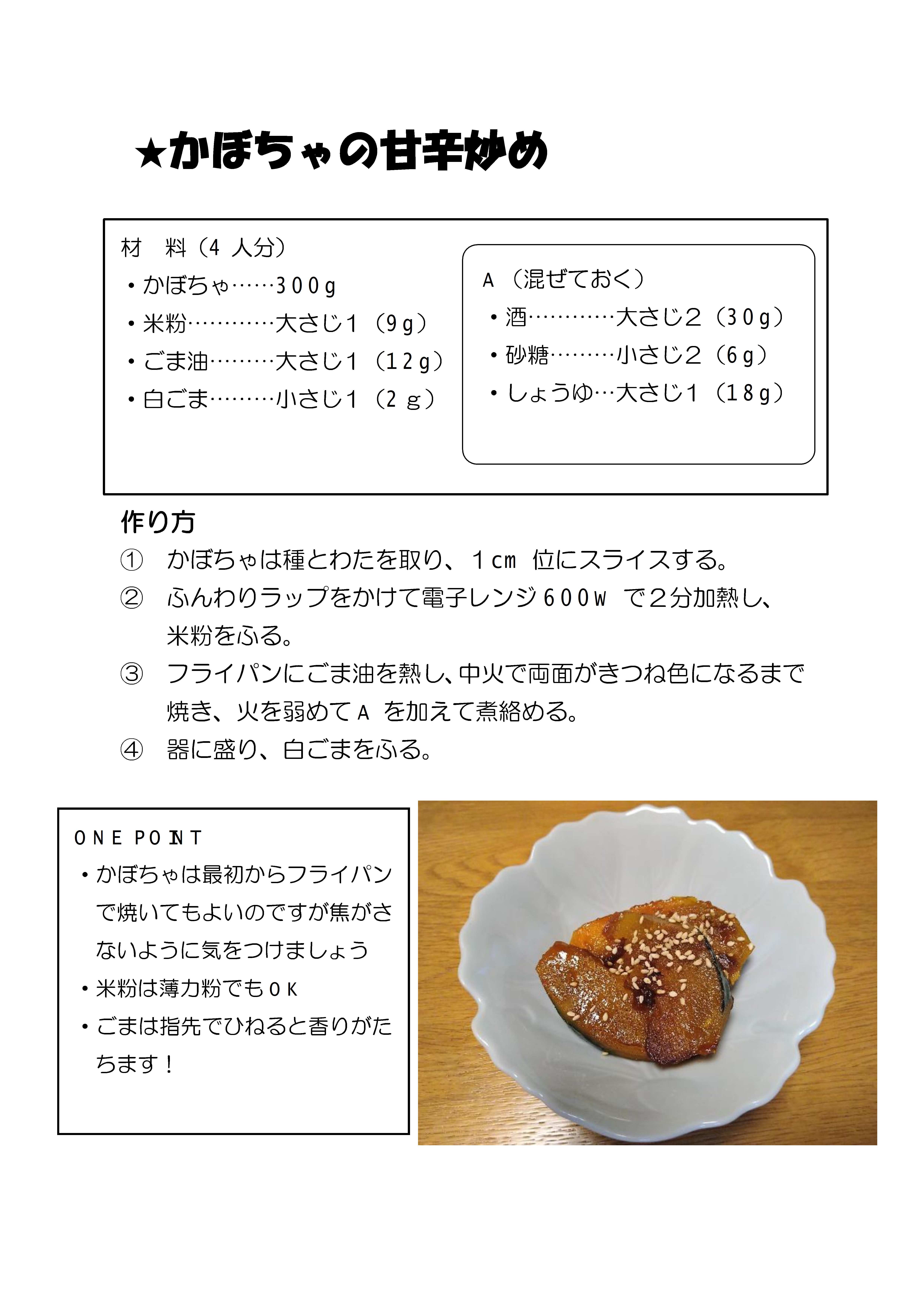 今月は旬のかぼちゃを使った「かぼちゃの甘辛炒め」です。
