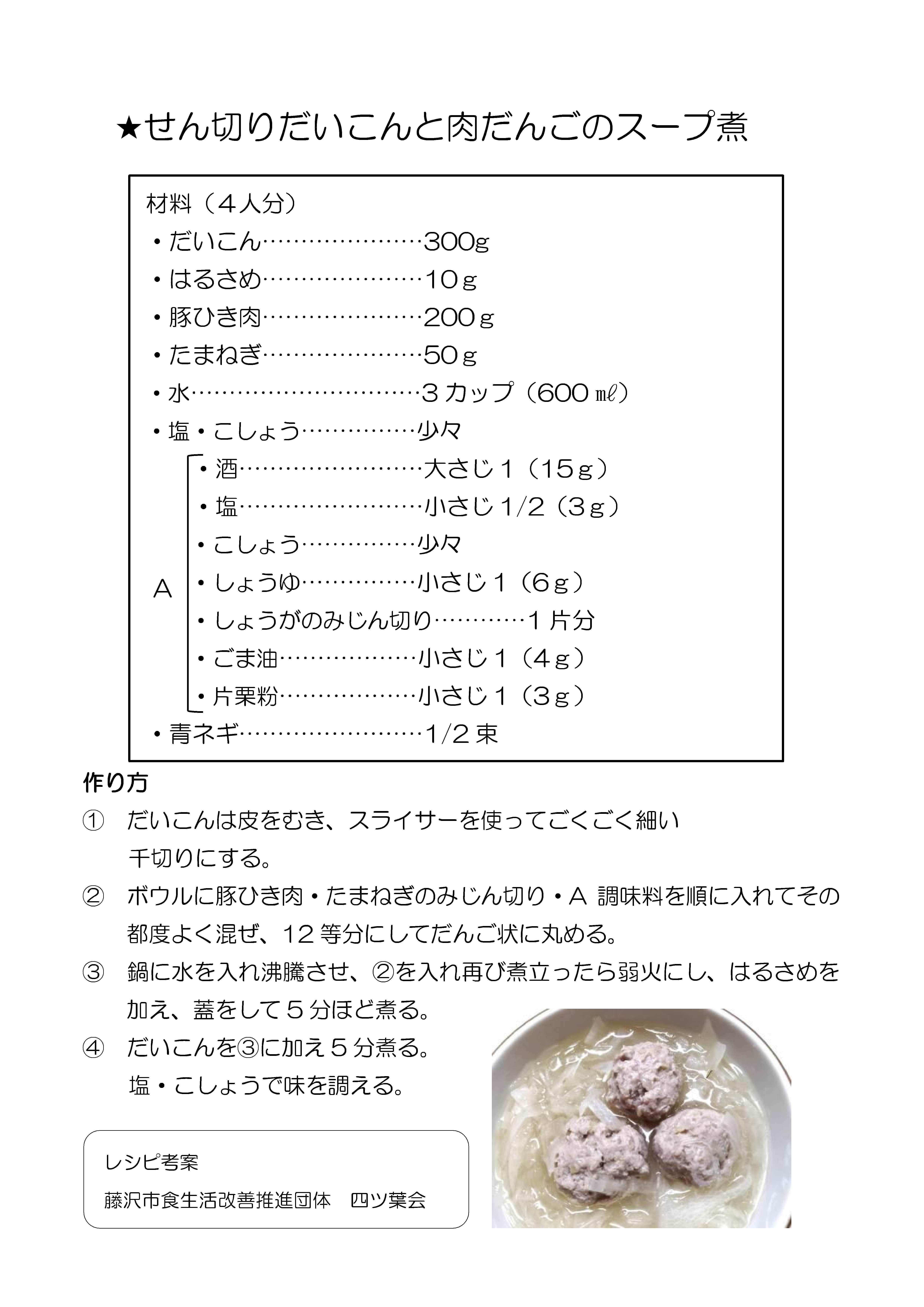 今月は旬のだいこんを使った「せん切りだいこんと肉だんごのスープ煮」です。