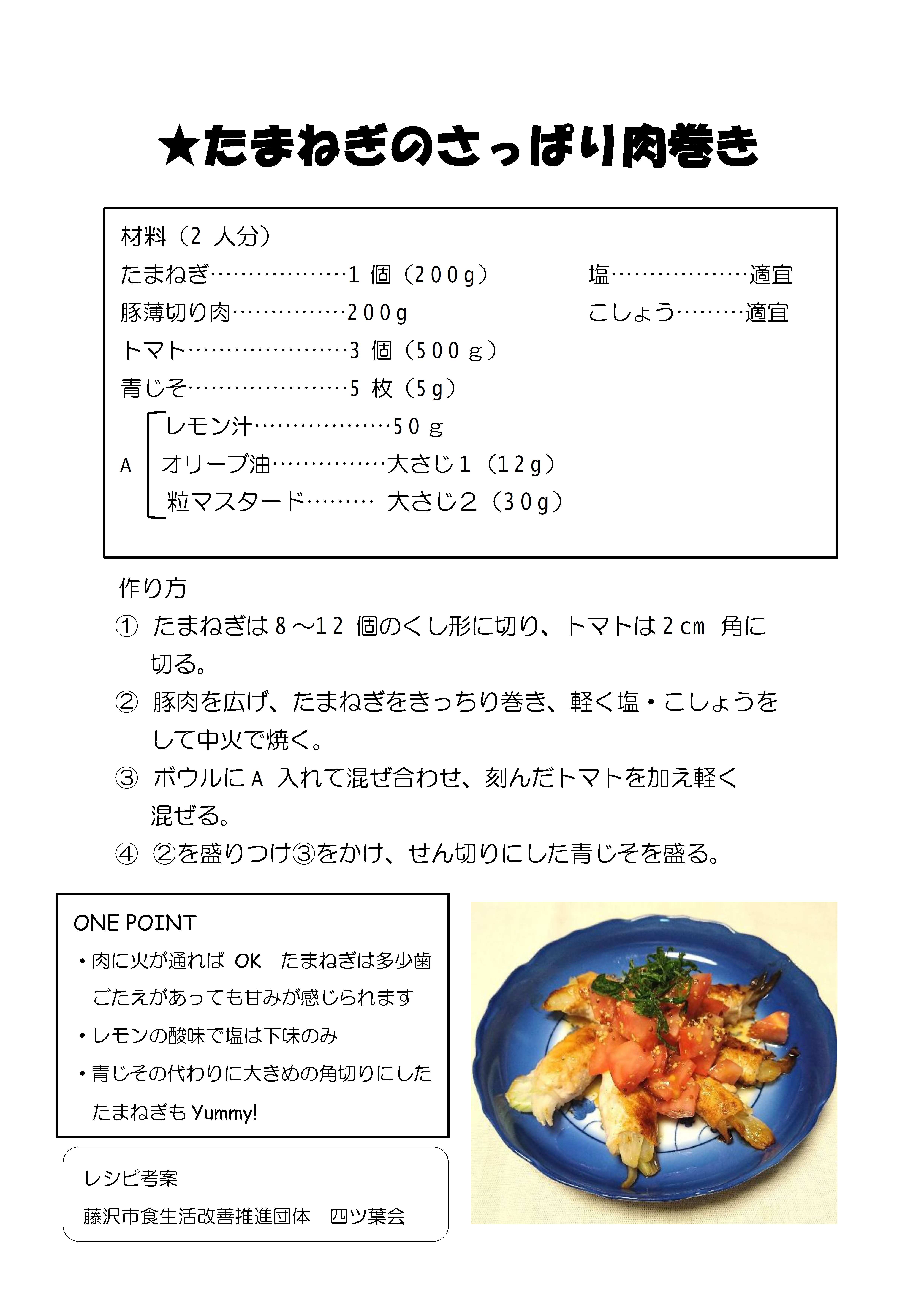 今月は旬のたまねぎを使った「たまねぎのさっぱり肉巻き」です。